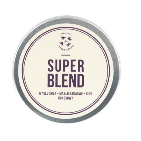 Masło Super Blend to kompozycja, w skład której wchodzą: nierafinowane masło shea, nierafinowane masło kakaowe i nierafinowany olej kokosowy. Tylko tyle i aż tyle - proste, a jednocześnie naładowane dobrem połączenie najwspanialszych, dobroczynnych olejów roślinnych. Po użyciu tego produktu skóra będzie mu niezmiernie wdzięczna - wyrazi to cudowną miękkością, gładkością, witalnością i zdrowym kolorytem. Kosmetyk doskonale uosabia filozofię Czterech Szpaków: mniej znaczy więcej.